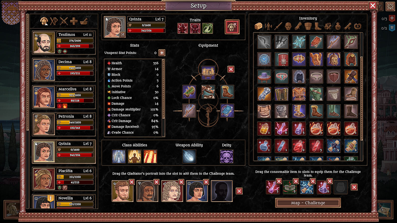 Combat unfolds in turn-based battles on a grid, where units act in order of initiative. Strategically move your gladiators, attack, and position them to outsmart and outmaneuver your opponents.
