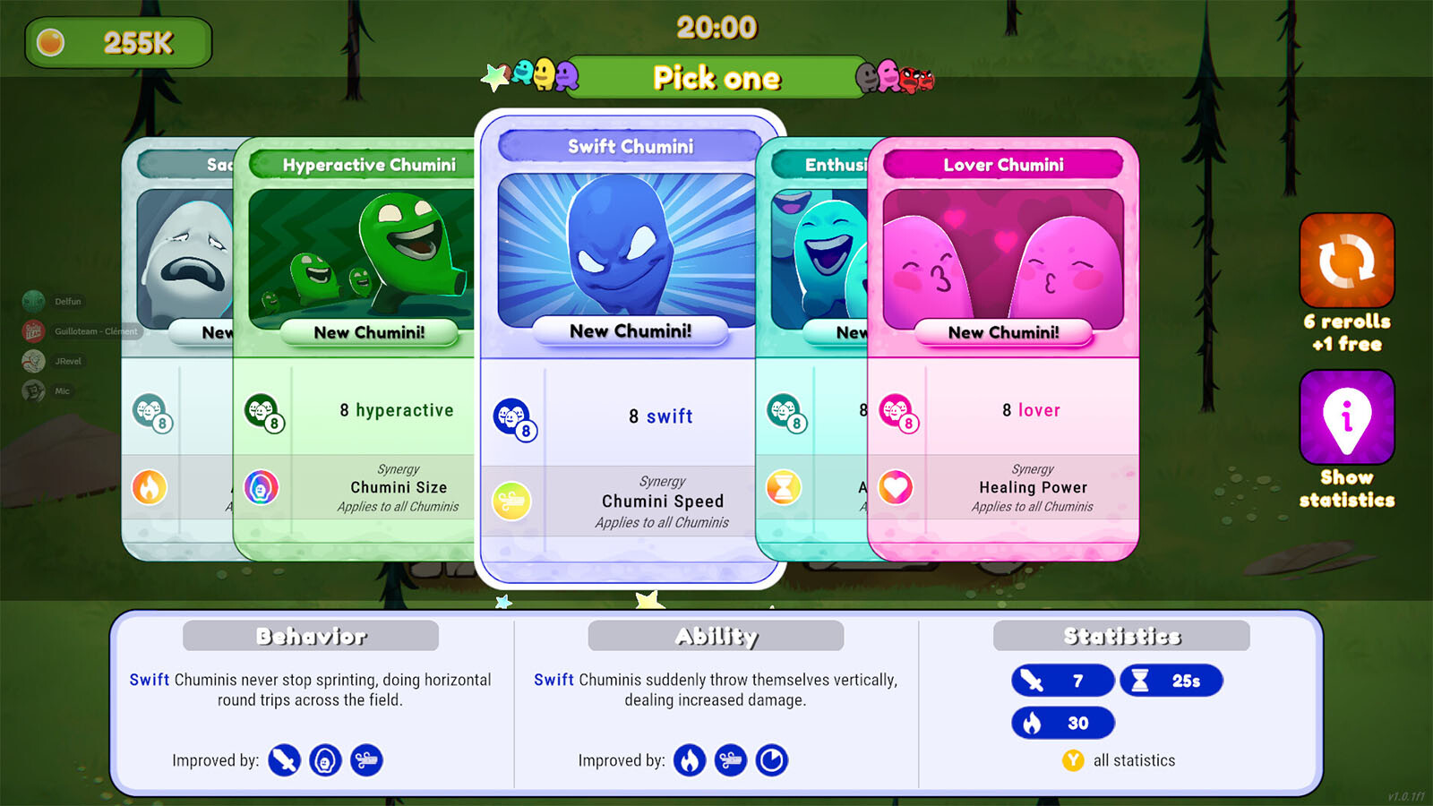 In this colorful survivors-like, summon your trusted allies, the Chuminis, to battle hords of forest demons! It’s up to you to manage each Chumini’s unique behavior to survive for 20 minutes, and defeat the Evil Shaman. There’re 12 different Chuminis to choose from: find the best synergies that suit your playstyle!