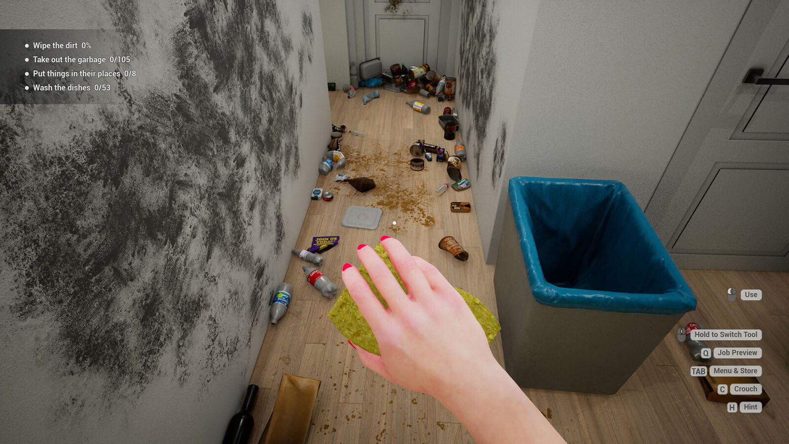 Whether you play just to unwind or aim to complete every task and earn the title of Cleaning Master, the game lets you play your own way. Mop the floors, scrub surfaces with the sponge, load the dishwasher, take out the trash, spray the flies, vacuum the carpets, organize scattered items, and blast away stubborn grime with a pressure washer!