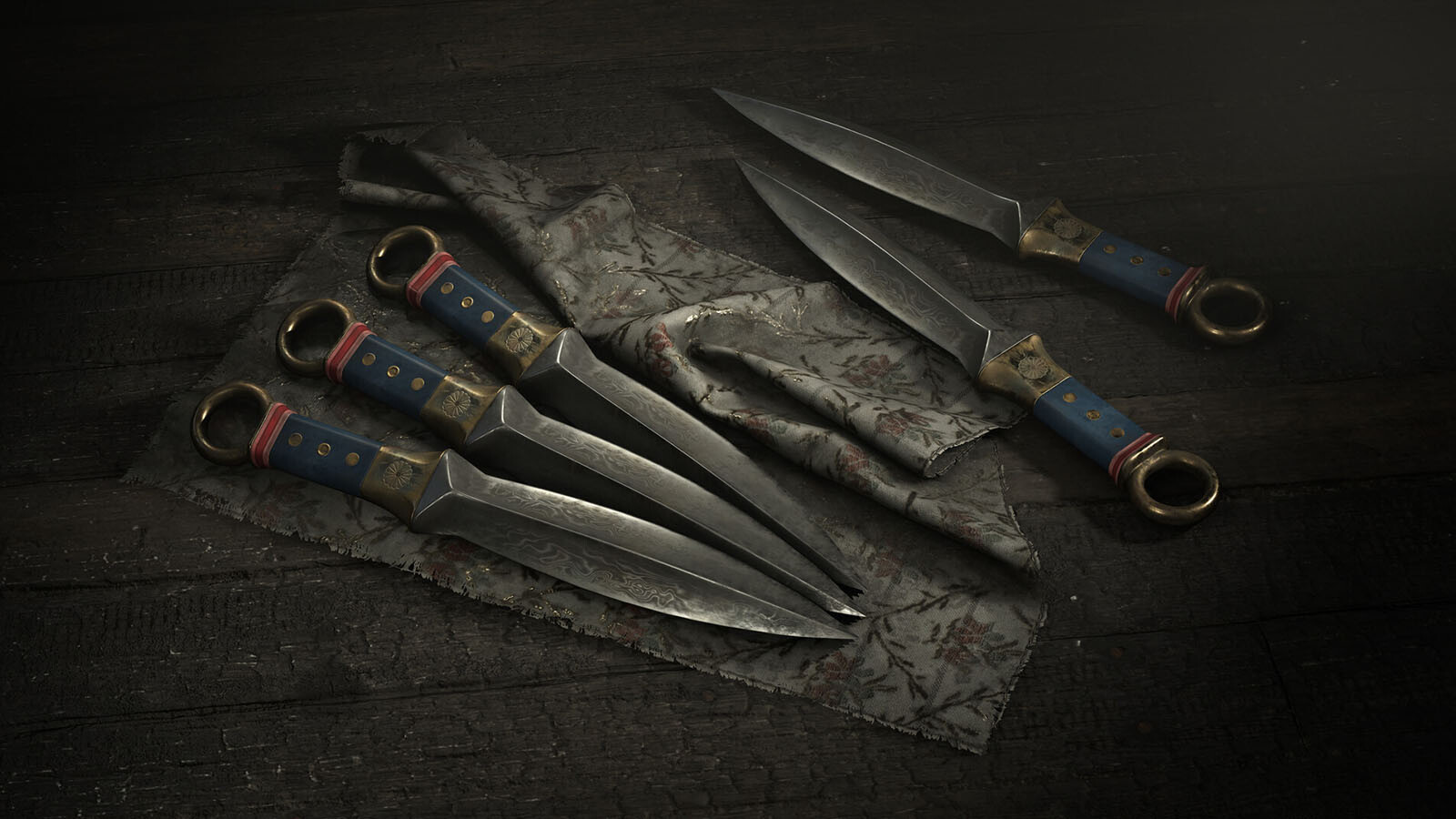 The eyelets of these throwing knives were used to string shimenawa rope to protect The Miko as her shrine burned. When they sink into the chest of a hunter, she still strings them to fulfill their unheard prayers.