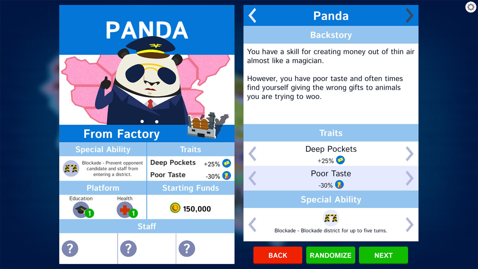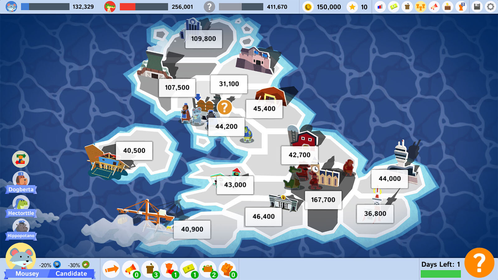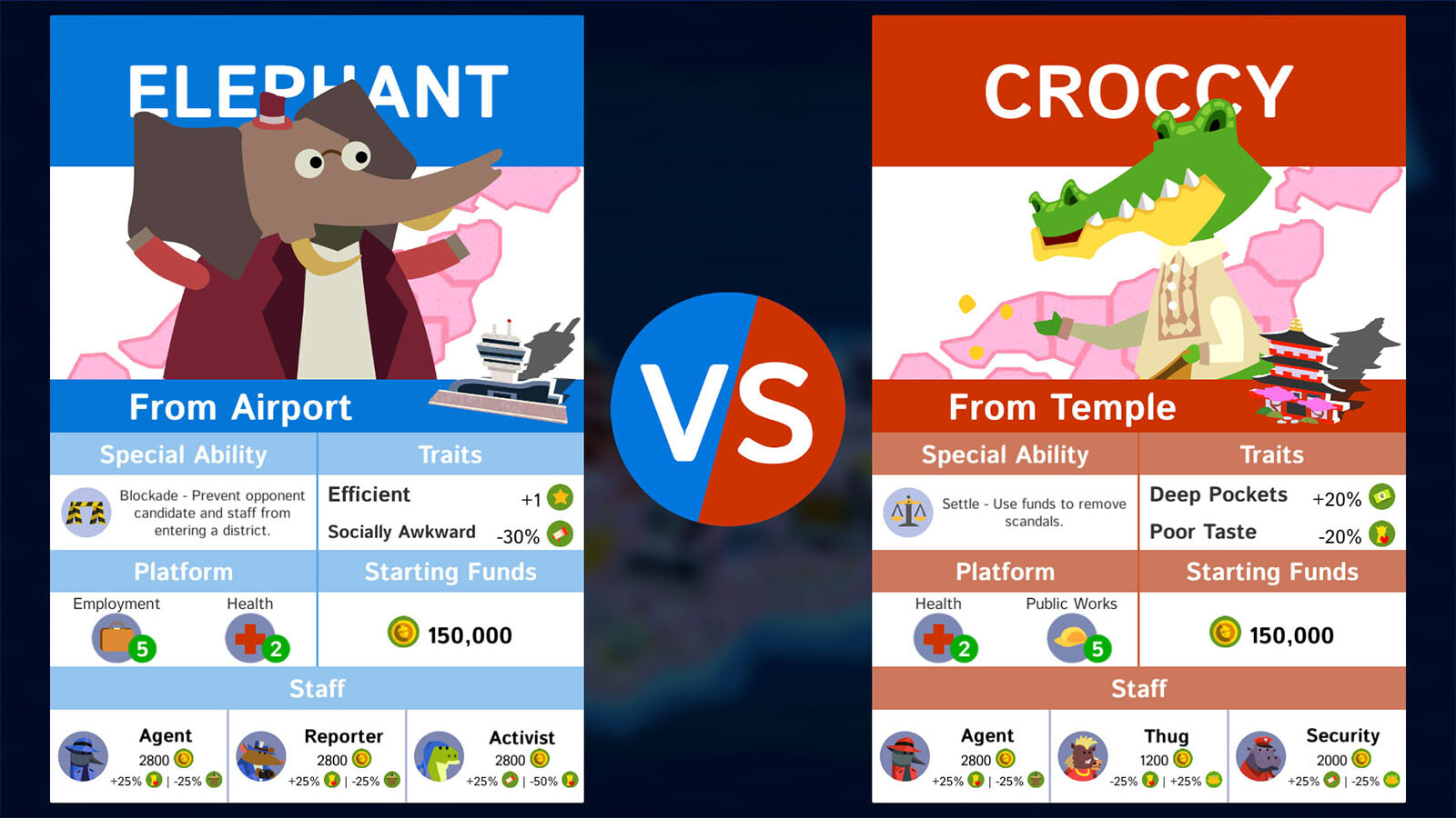 Political Animals is an election simulation game set within a world populated by corrupt crocodiles and meritocratic mice. In a political contest where corruption is always around the corner, find out just how incorruptible you really are. Do you have the integrity of Mousey or the ruthlessness of Croccy? Will you fight your campaign on issues and in the best interests of the people, or will you succumb to the easier path of bribery and intimidation? Will you win votes...or will you buy them?