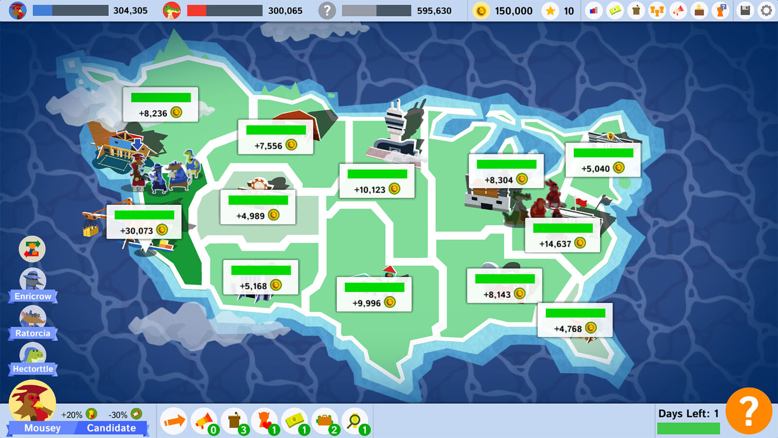 Each turn you spend logistics to move your candidate and their staff around the political landscape to whip up popular support. Your choice of staff affects your strategy! A lawyer can settle your scandals, but a preacher can energize the population. Raise funds from the wealthy, give gifts to political patrons, or hold rallies to build grass-roots support from the electorate. Along the way, expect to encounter scandals both real and fabricated as well as random events that test your moral mettle.