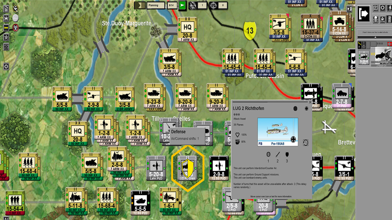 Air assets represent Allied and German air groups that can conduct counter-air, interdiction, air resupply, bombardment, and ground support missions. Air reconnaissance assets can collect critical information about enemy location, unit types, and strengths.